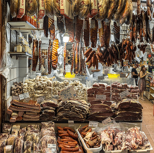 Frios — queijos (Parmesão, Brie, Manchego), presuntos (como o pata negra), defumados.